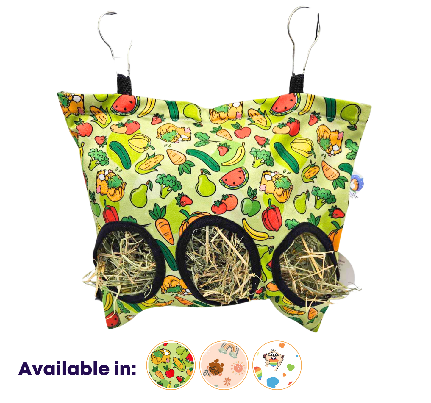 Our Hay Sack keeps hay off the ground, ensuring it remains mess-free and preventing soiled areas, maintaining hay's freshness in one convenient place. Designed with three reinforced access holes, it accommodates even the largest herds of guinea pigs or the hungriest rabbits, promoting easy access to fresh, clean hay at all times.