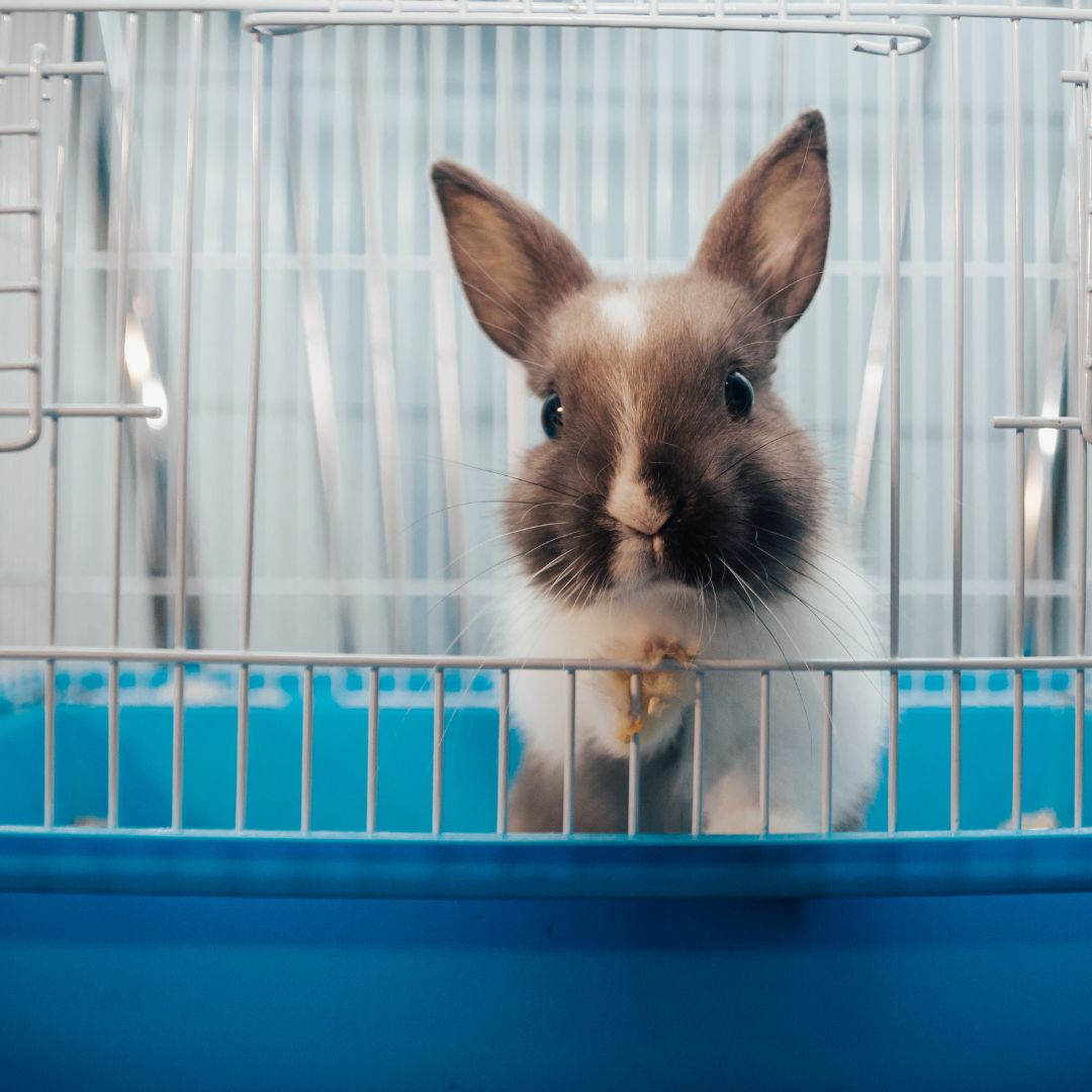 We recommend against cages with a wire floor as it is easy to rip toenails and injure feet, as well as predispose to conditions such as bumblefoot. It is also important to have a cage set up to contain our pet bunnies if it is dangerous for them to be out, or to isolate and contain a sick or unwell rabbit â For example a bunny with a back injury will be required to be confined as it heals. The ideal size for any kind of confined space is approximately 3-4x the length of a stretched out adult rabbit â this means that larger breeds will require more space. It is also an important factor to keep in mind when adopting a baby bunny, and keeping their predicted adult size in mind when setting up their cage.Â